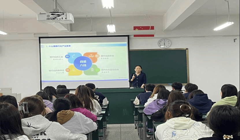 党委副书记、校长陈颖以“你对产业的了解有哪些?”为导入,从现代化产业体系的深刻意蕴、产业体系建设的现状与挑战、现代产业体系建设的着力点等方面,结合学生专业实际、职业教育与产业关系、云南的“产业强省”战略等,采用大量实例,为学生讲解了“大力推进现代化产业体系建设”专题。