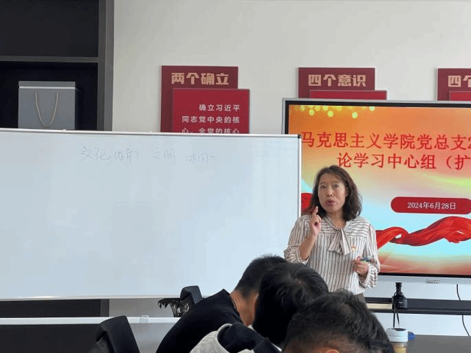 张延星领学习近平文化思想。从文化与文明的联系区别切入到习近平文化思想的内涵介绍,理清文化与意识形态、社会主义核心价值观、中国共产党人精神谱系、中国特色社会主义文化、中华优秀传统文化、中国自信、文化强国之间的逻辑关系。