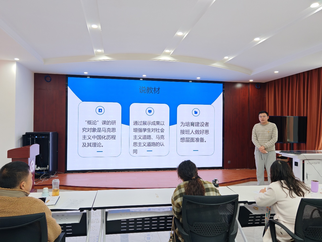 比赛共有五位参赛选手,分别代表《思想道德与法治》《毛泽东思想和中国特色社会主义理论体系概论》《习近平新时代中国特色社会主义思想概论》《中华民族共同体概论》四门课程参赛。本次比赛采用现场说课形式,参赛选手结合课程特色,从教学分析、教学策略、教学过程、教学反思等几个方面进行详细阐述。五位老师精心准备、全心投入,说课结构完整,语言简洁流畅,充分展示了过硬的专业素质,彰显了新时代教师的育人风采。