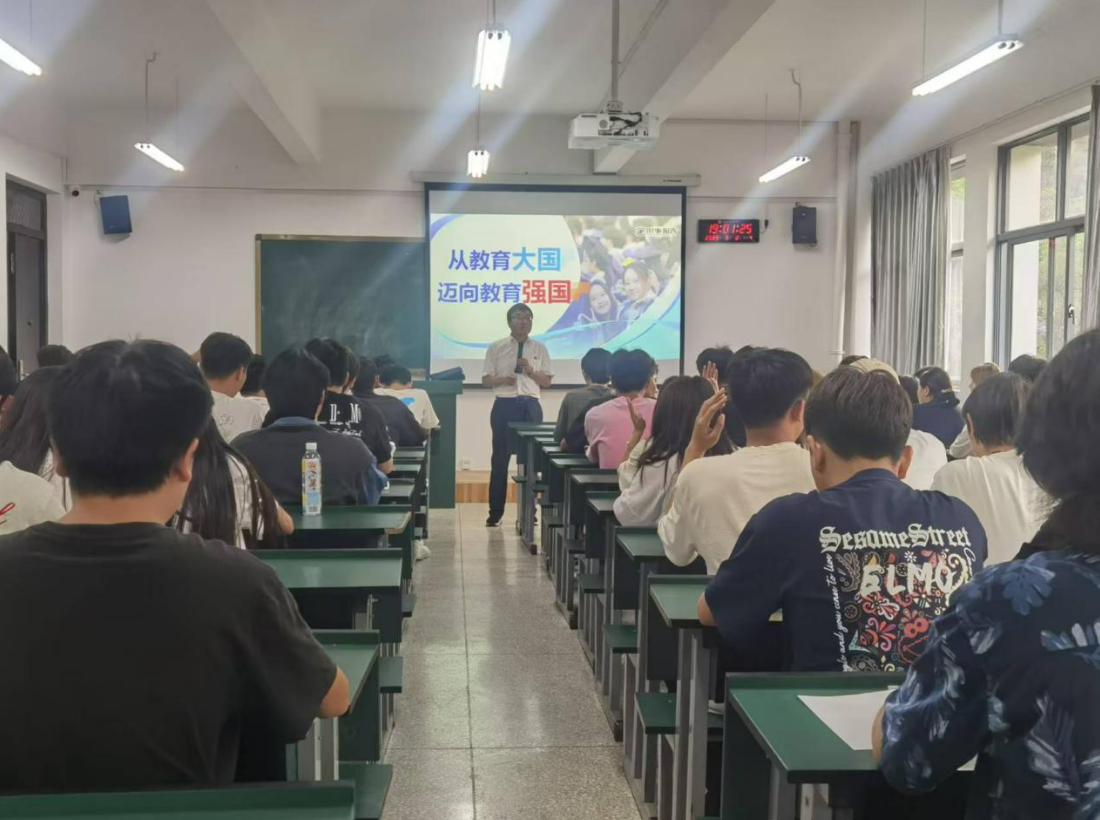党委委员、副校长李光祥以“从教育大国迈向教育强国”为题,以生动案例导入,启发学生思考“大是否意味着强?”通过案例分析、互动问答等形式,结合国家发展战略与学校办学特色,阐述了“两个三、一个五”,即教育强国的“三大属性”、中国科技的“三跑并存”、教育评价体系的“破五唯”,引导学生理解教育对实现民族复兴的关键作用。并结合个人成长经历启发学生要把个人成长与国家需求紧密结合,勉励学生夯实专业基础、坚持目标导向,在科技创新、基层服务等领域勇担使命。