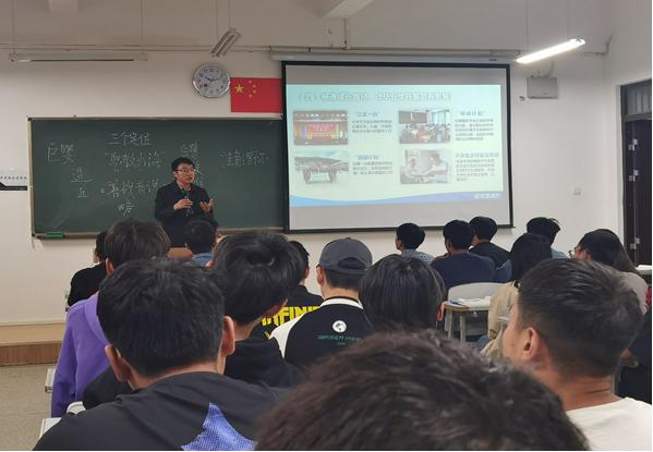 学校党委委员、党委书记牛定柱以“当前国际形势与中国原则立场”为题,从“看”“行”两个字来谈大学生为何要了解国际形势和中国原则立场。首先,大学生要开阔视野,要学会看问题。应从站在中国看中国的视角能够跳出区域局限,从世界看中国,思考如何让中国走近世界舞台的中央。其次,大学生要做到看势而为,做时代需求的人才。从云南的“三个定位”来谈学校建设目标,从职业教育的五大职能与国际形势的联系引导学生思考如何在时代发展的潮流之中学好自身专业,做到顺势而为。倡导学生要学习优秀学长学姐们能下基层、能找矿,能为让中国走近世界舞台中央贡献自身的力量。最后,从“职教出海”的发展趋势让学生理解“书要看进去,人要走出去”。学校积极顺应形势发展,作为学生的他们更应该顺应时代发展变化,会看会做,做到看势而为,成为合格的社会主义建设者和接班人。